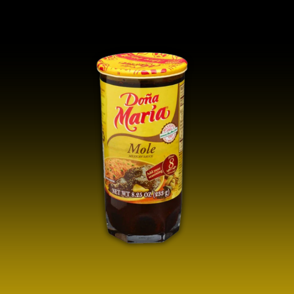 Mole or mole sauce Doña Maria is a dark brown Mexican sauce or gravy made from dry chiles, nuts, spices, vegetables, chocolate and seasonings. It takes a great deal of time to prepare and is served as chicken mole, in beef or pork for special occasions and holidays in Mexico. Mole Poblano, Mole verde, Pipian and Adobo are some other variations of mole.